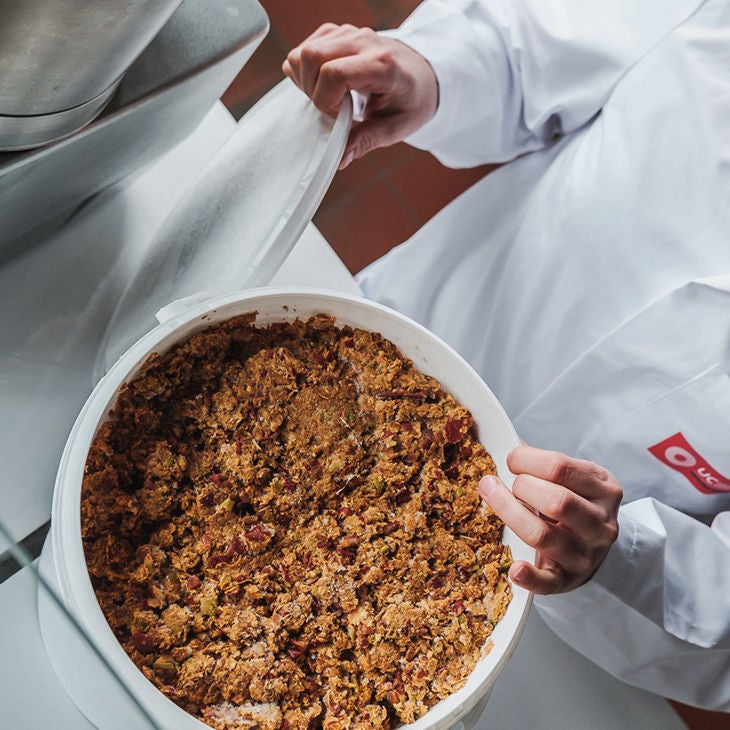 ‘La production de pommes et de poires en Belgique s’élève à environ 600 000 tonnes par an. Près de 100 000 tonnes restent cependant invendues, généralement parce que les fruits sont endommagés ou ont dépassé la date de péremption, et sont jetées. Pour préparer son cuir alternatif, l’équipe d’APPEAL récupère ces déchets et les transforme au fil d’un procédé spécifique. Les fruits sont tout d’abord mixés et réduits en pulpe. Ils sont traités dans leur intégralité, aussi bien la chair que la peau, les pépins ou le trognon, afin de conserver une quantité maximale de fibres. Ces dernières assureront en effet une meilleure texture et une plus grande résistance. La fine pâte obtenue est encore renforcée par quelques adjuvants naturels avant d’être cuite au four pour éliminer toute présence bactérienne. Une pomme est composée à 85 % d’eau, la cuisson va éliminer 90 % de l’humidité et concentrer la matière sous la forme de minces feuilles souples de 40 cm sur 60 qui n’auront plus qu’à être découpées ou assemblées.