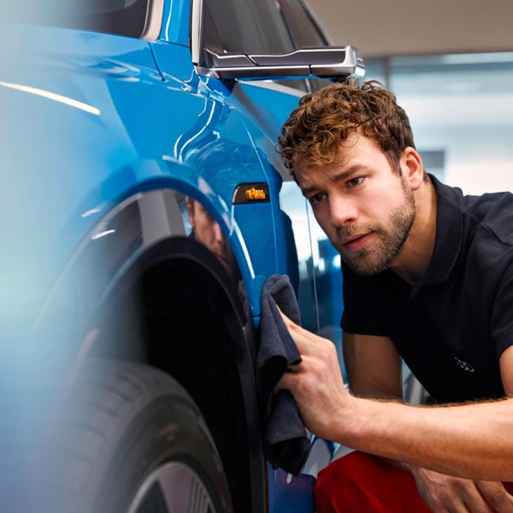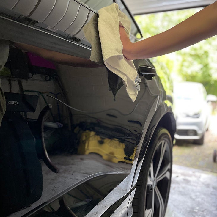 Lorsque votre carrosserie est bien sèche et propre, et toujours à l’ombre, vous pouvez terminer l’entretien de l’extérieur de votre Audi par un traitement au polish. Ce produit est l’arme idéale pour enlever toute rayure que vous avez remarqué sur la peinture. Passez d’abord une barre ou un pain d’argile sur votre Audi pour enlever toutes les impuretés invisibles à l’œil nu qui ont adhéré à la peinture. Même le meilleur lavage laisse toujours de minuscules taches de goudron ou des dépôts de carbone. Couvrez ensuite toutes les parties en plastique, en verre, en fibre de carbone de mat et les joints en caoutchouc, sous peine de les rendre blanches au contact du polish.