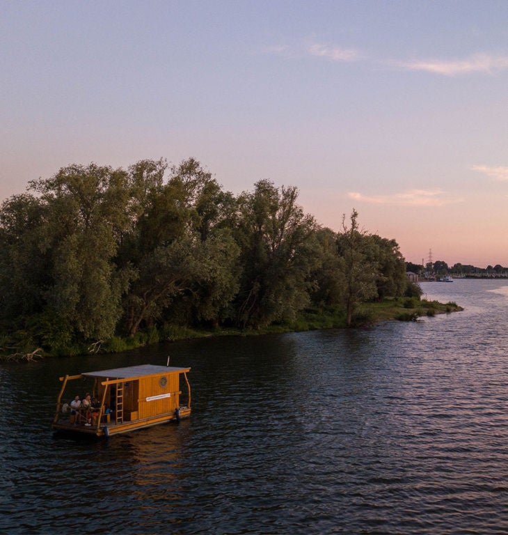 Bien échaudés par la température caniculaire de 33 °C, Charlotte et ses amis sont heureux de se diriger vers leur logement pour se rafraîchir. Et bien sûr, ils n’ont pas choisi une « simple » chambre d’hôtel. Le groupe s’apprête en effet à passer la nuit sur un radeau. Après avoir soigneusement garé l’Audi e-tron Sportback, ils se dirigent vers leur embarcation, prêts à naviguer sur les eaux limbourgeoises belges et hollandaises. Une fois l’ancre jetée, ils profitent d’une soirée et d’un coucher de soleil exceptionnels, avant de passer la nuit à la belle étoile, sur le toit de la cabine.