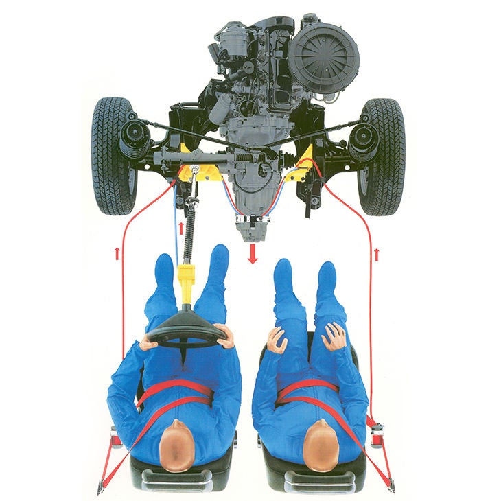 Grâce aux mesures devenues de plus en plus précises, notamment grâce à l’utilisation des caméras, Audi parvient en effet en quelques années à breveter sa première innovation : le système « Procon-ten », soit programmed contraction and tension, ou « contraction et tension programmées » en français. Son principe : lors d'une collision frontale, le volant est tiré vers l'arrière et les ceintures de sécurité avant sont tendues grâce au déplacement du moteur vers l'habitacle par un système de câbles d'acier et de poulies de renvoi. Introduit en 1986, ce système a permis de réduire considérablement le risque de blessure à la tête du conducteur et n'a été abandonné qu'après l'introduction des airbags dans tous les modèles.