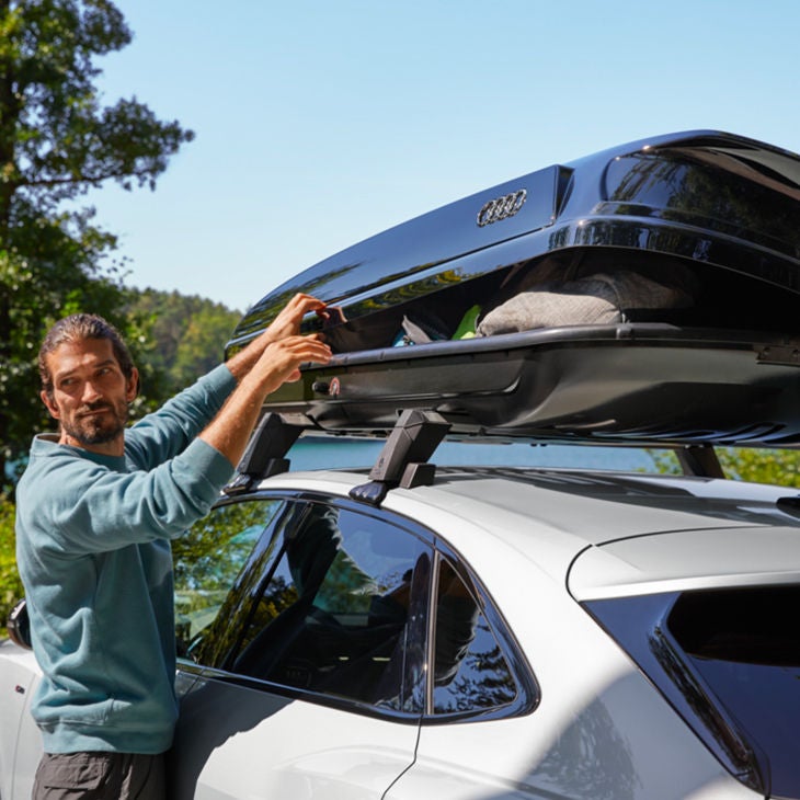 Lorsque vous voyagez en avion, vous êtes souvent limité(e) pour les bagages. Pas avec votre Audi, car vous pouvez ajouter des espaces de rangement en plus du coffre de votre voiture déjà spacieux grâce aux porte-tout Audi. Vous avez le choix parmi différentes couleurs et dimensions qui s’adaptent parfaitement à vos besoins : assez grand pour transporter vos skis et assez compact pour un montage facile.