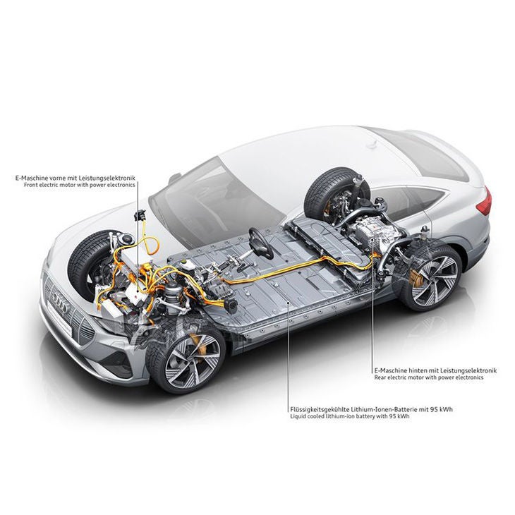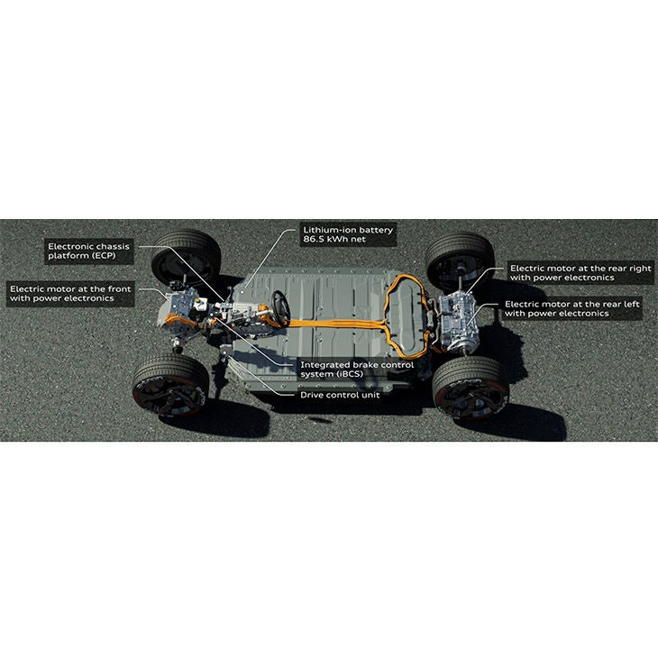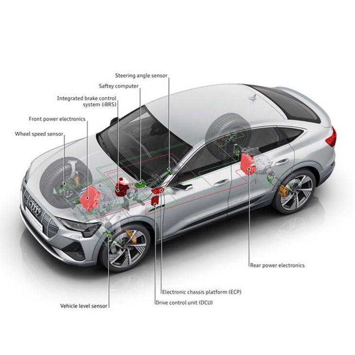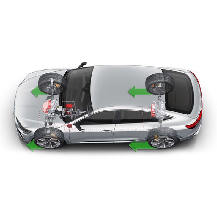 Les modèles e-tron S possèdent un moteur pour l’essieu avant et deux sur l’essieu arrière. Grâce à la vectorisation de couple électrique, l’e-tron S peut développer un couple spécifique à gauche et à droite sur l’essieu arrière, ce qui offre une plus grande maniabilité. Ainsi, l’e-tron S propose des fonctions de blocage de différentiel transversal contrôlé et donc les fonctions d’un différentiel sport sans connexion mécanique entre les deux moteurs électriques sur l’essieu arrière. Le système peut être activé uniquement à l’aide du logiciel. Audi instaure donc une répartition du couple active et totalement variable sur l’essieu arrière.